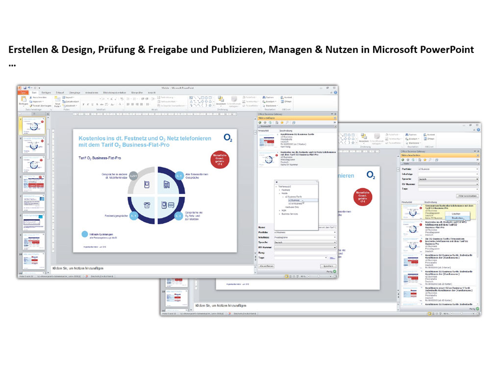 PowerPoint erstellen, mit relevanten Metainformationen anreichern und bereitstellen oder diese innerhalb ihrer regulären Microsoft PowerPoint-Umgebung verwalten. O2 und authorisierte