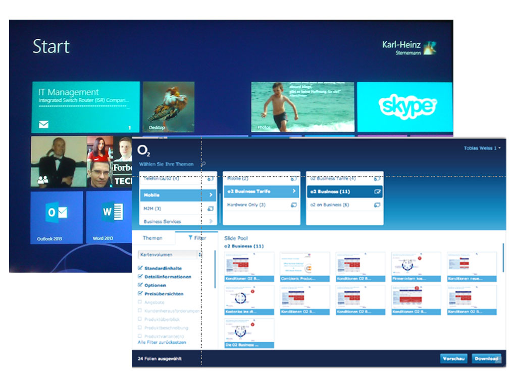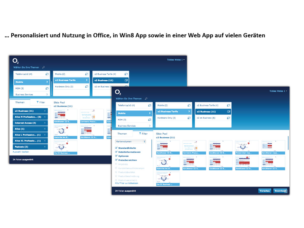 Vertriebsmitarbeiter der Geschäftspartner können bequem über verschiedene Apps mit iPAD, Windows Tablets oder via Web-Browser auf die relevanten Folien zugreifen. Somit können thematisch